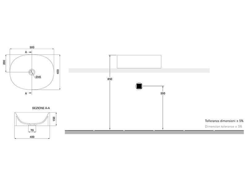 SCARABEO SKINNY 5408 Раковина накладная без отверстия под смеситель, без слива-перелива. Все стороны покрыты эмалью. Размеры: 50x40x15h см. Цвет Matt Air.