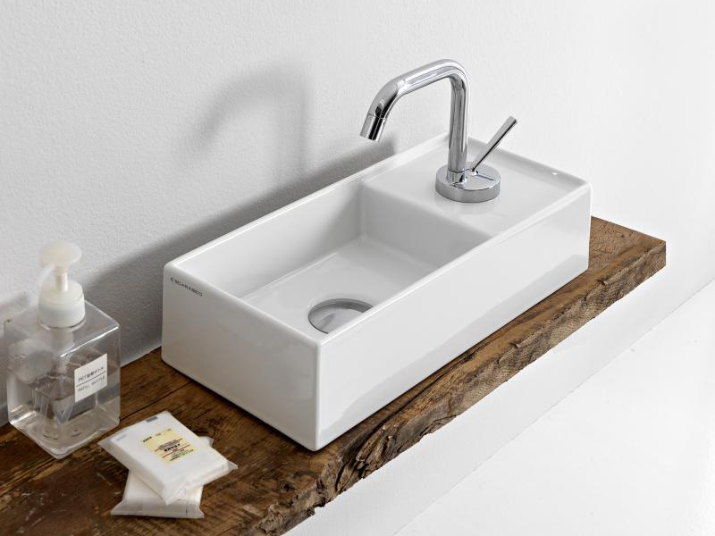 SCARABEO TEOREMA 2.0 5129 Раковина накладная с одним отверстием под смеситель справа, без перелива. Размеры: 41x19x10h см. Рекомендуется установка на столешницу. Цвет White.