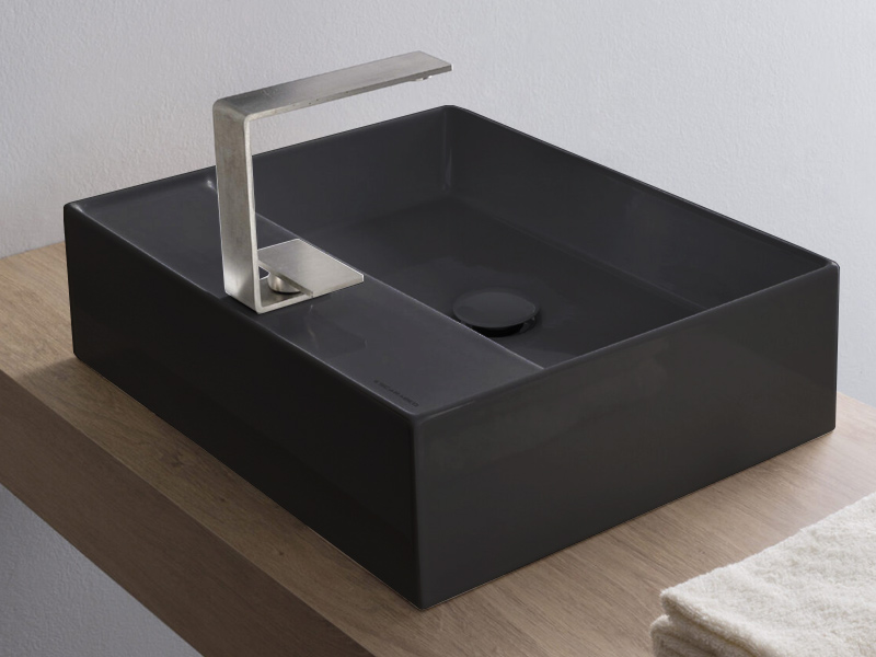 SCARABEO TEOREMA 2.0 5112 Раковина накладная с одним отверстием под смеситель, с сливом - переливом. Все стороны покрыты эмалью, рекомендуется установка на столешницу. Перелив входит в комплект. Размеры: 50,5x38,5x14h см. Цвет Night.