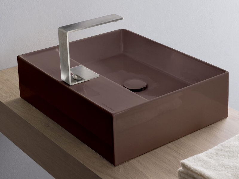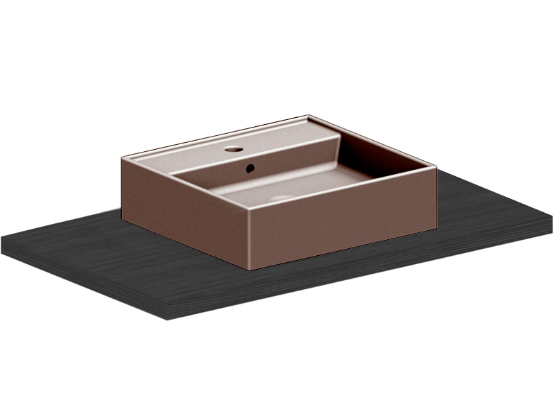 SCARABEO TEOREMA 2.0 5112 Раковина накладная с одним отверстием под смеситель, с сливом - переливом. Все стороны покрыты эмалью, рекомендуется установка на столешницу. Перелив входит в комплект. Размеры: 50,5x38,5x14h см.Цвет Glossy Tobacco.