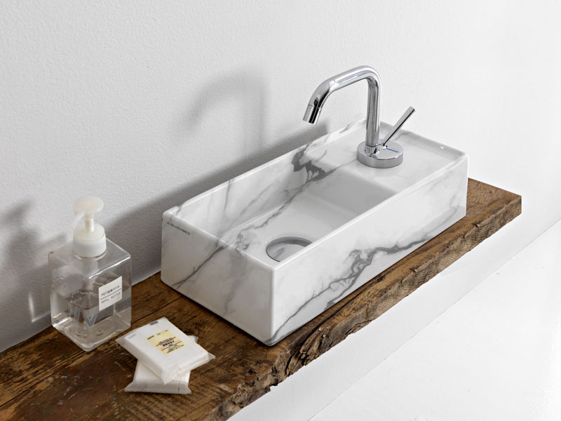 SCARABEO TEOREMA 2.0 5129 Раковина накладная прямоугольная. Справа одно отверстие под смеситель, без слива-перелива. Все стороны покрыты эмалью. Рекомендуется установка на столешницу. Размеры: 41x19x10h см. Цвет Marble White.
