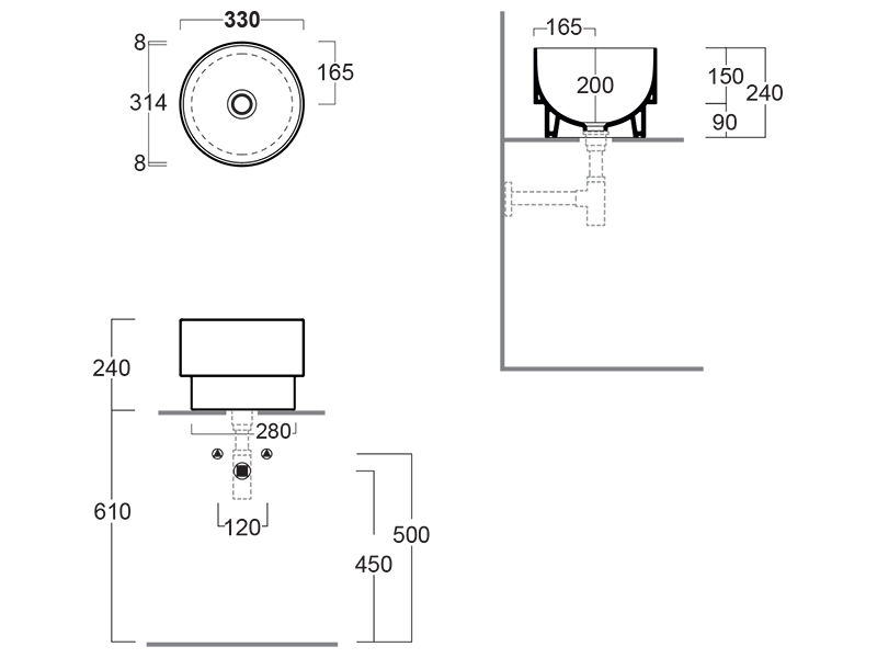 Описание товара: Раковина имеет круглую форму, диаметр - 33 см. Высота - 42 см. Раковина выполнена из фаянса белого цвета.