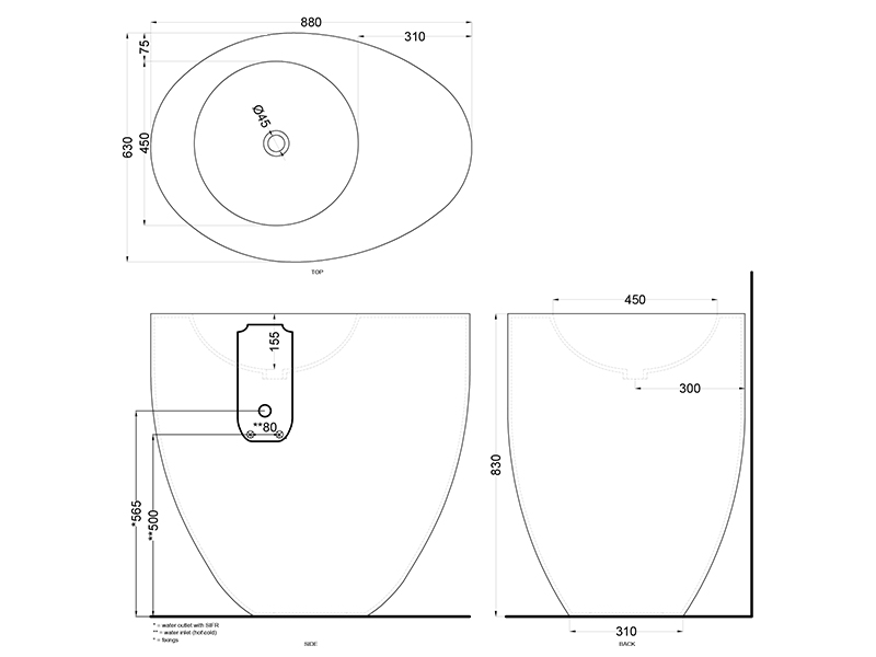 CIELO LE GIARE LGFREE Раковина напольная, отдельностоящая без отверстия под смеситель, без слива-перелива. Рекомендованна пристенная установка. Все стороны покрыты эмалью. Размеры: 88x63x83h см. Цвет Polvere.