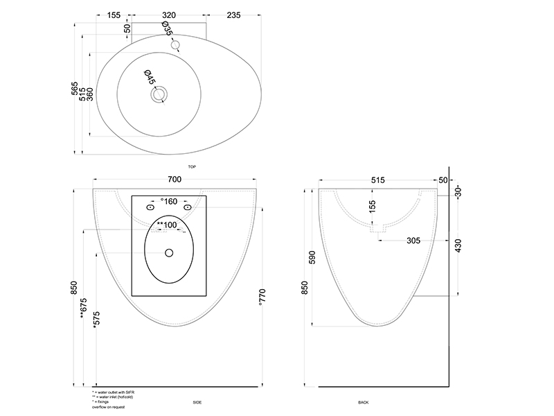 CIELO LE GIARE LGLS70 Раковина подвесная с одним отверстием под смеситель, без слива-перелива. Возможен слив-перелив по запросу. В комплекте с крепежами. Одна сторона не покрыта эмалью. Размеры: 70x56x59h см. Цвет Cipria.