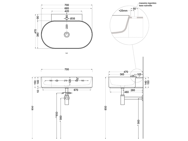 CIELO MARE MRLS70 Раковина подвесная с одним отверстием под смеситель с возможностью выполнения трех отверстий, без слива - перелива, одна сторона не покрыта эмалью. При установке на столешницу рекомендуется запросить опцию "RETTIFICA". Продается в комплекте с крепежами. Размеры: 70 x 47 x h15 см, цвет Cipria. Представленная модель раковины существует в различных цветовых решениях.