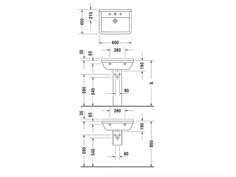 STARCK 3 Умывальник с переливом с плоскостью под смеситель 1 готовое отверстие для смесителя возможны 2 дополнительных отверстия по заказу размер 60х45 см цвет белый