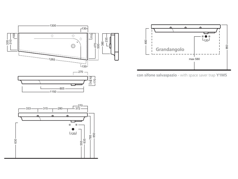 Раковина подвесная HATRIA GRANDANGOLO YXF601, с переливом, с 1 отверстием для смесителя (намечено еще 2 отверстия), трапециевидной формы, полка слева, размер 130х50х33.5 см, цвет белый. Установка подвесная или на тумбу. Крепления (2 штуки), донный клапан и сифон приобретаются отдельно.