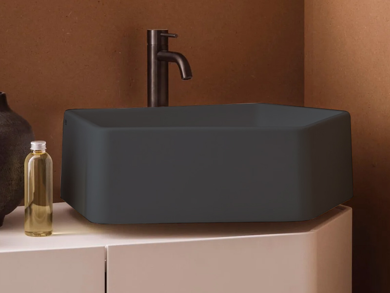 CIELO KANTO KALS Раковина подвесная с одним отверстием под смеситель, без слива-перелива. Возможна установка на столешницу. Одна сторона не покрыта на столешницу. В комплекте с креплениями. Размеры: 50x52x18h см. Цвет Basalto.