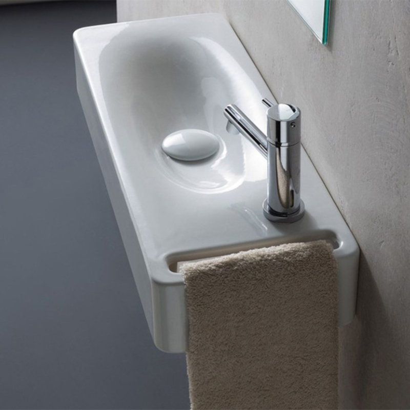 Раковина подвесная Scarabeo HUNG 1512, без перелива, с одним отверстием под смеситель, с полотенцедержателем справа, крепления в комплекте, размер 50х22х9 см, цвет белый глянцевый.
