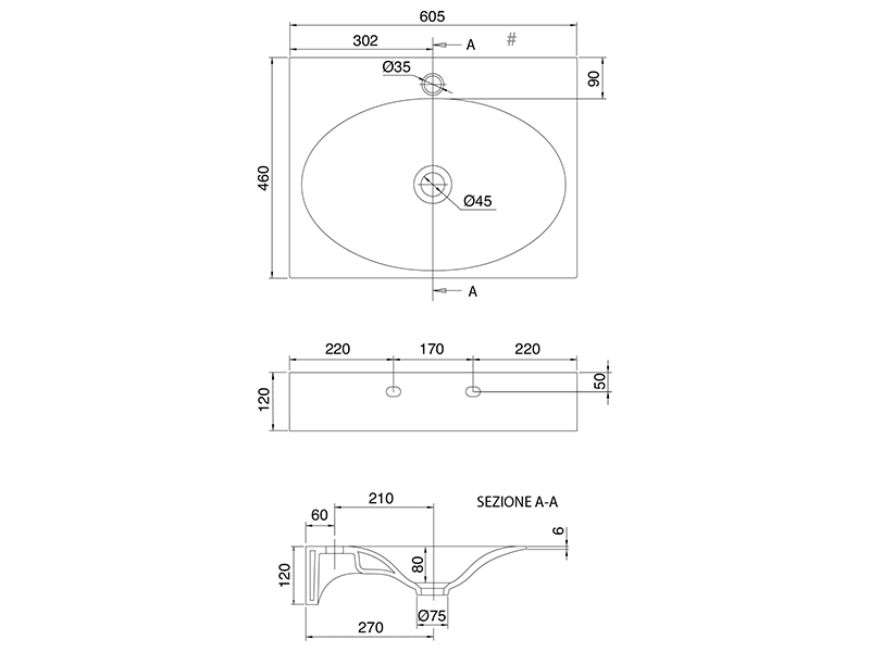 SCARABEO VEIL 6102 Раковина подвесная с одним отверстием под смеситель, без перелива. Размеры: 60,5x46x12h см. Настенные крепления входят в комплект. Цвет Ardesia.