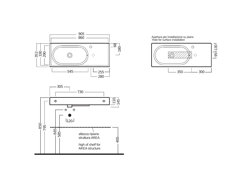 Раковина подвесная\встраиваемая HATRIA AREA Y0UE01, размер 90х35 см, цвет белый. Раковина поставляется без отверстий для смесителя, с двумя намеченными отверстиями. Может дополняться хромированным полотенцедержателем, донным клапаном и сифоном. Устанавливается на стены с помощью крепежа (приобретается отдельно), устанавливается на мебель, столешницы и подстолья.
