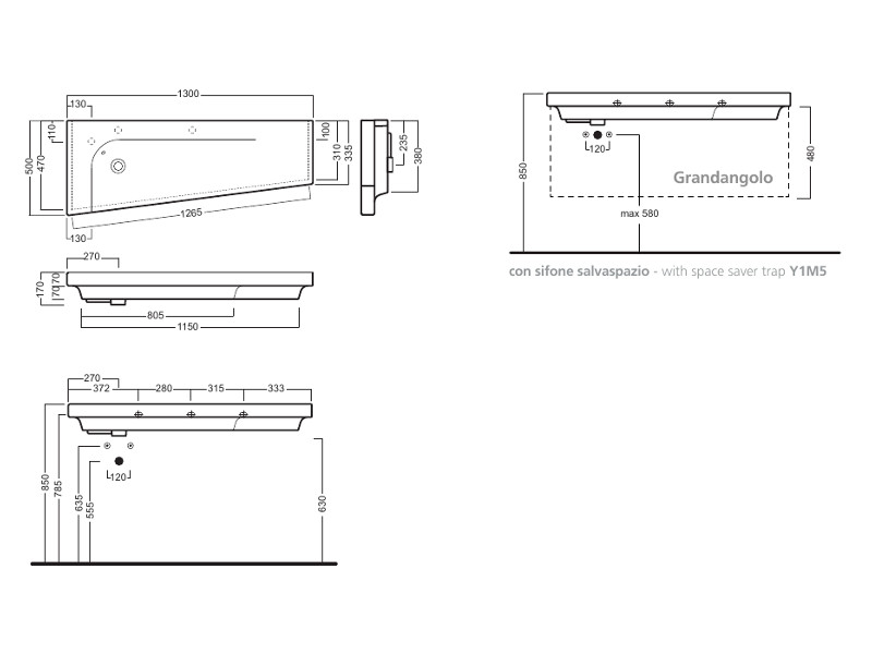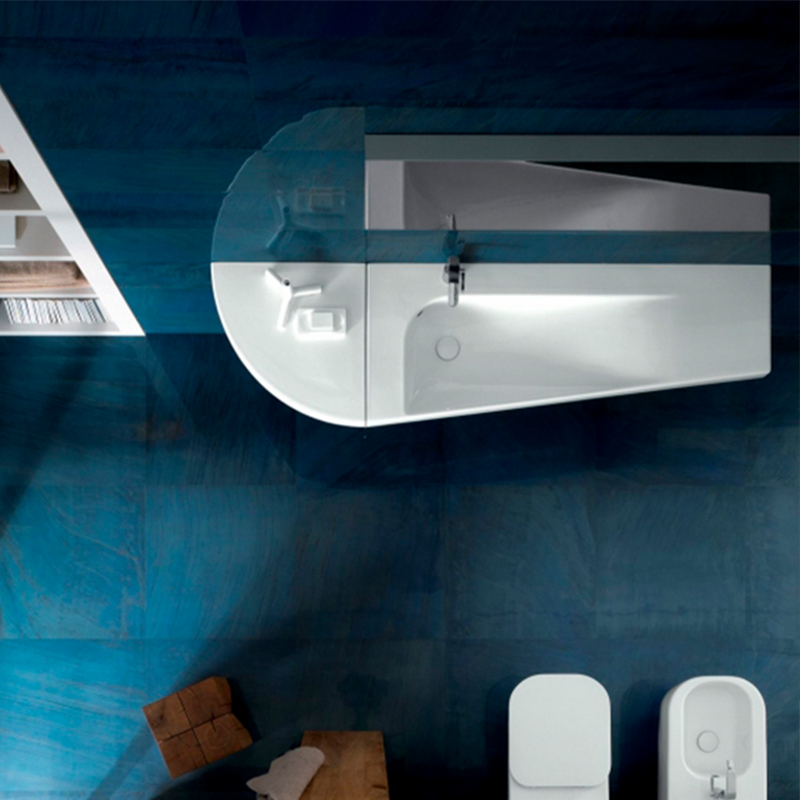 Раковина подвесная HATRIA GRANDANGOLO YXF501, с 1 отверстием для смесителя (намечено еще 2 отверстия), трапециевидной формы, полка справа, размер 130х50х33.5 см, цвет белый. Установка подвесная или на тумбу. Крепление (2 комплекта), донный клапан и сифон приобретаются отдельно.