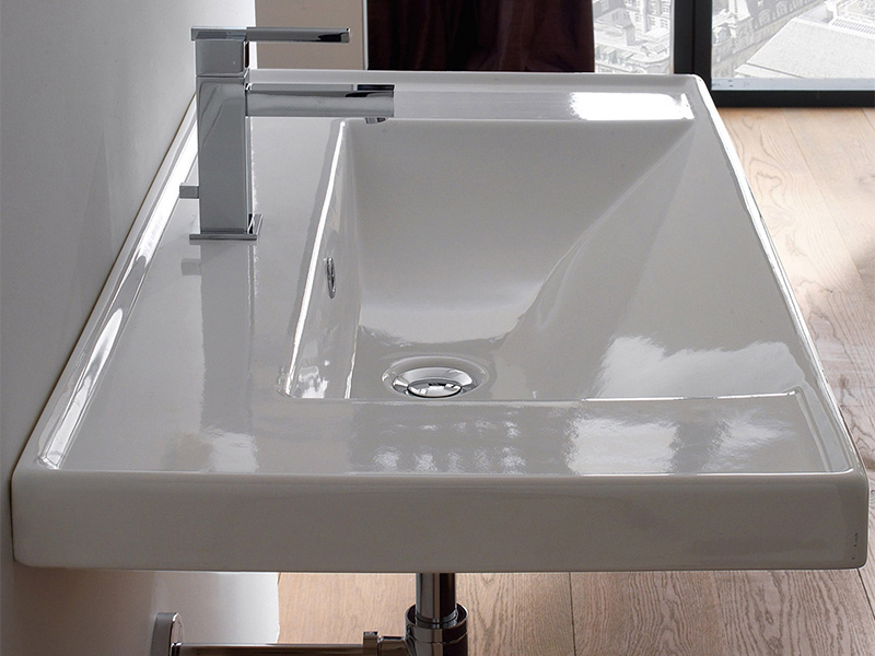Раковина выполнена в белом глянцевом цвете, что придаёт ей свежий и стильный вид. Гладкая поверхность не только эстетична, но и легко очищается от загрязнений, что особенно важно в условиях ванной комнаты. Прямоугольная форма раковины добавляет современности и делает её универсальной, позволяя легко вписать её в любой интерьер — от классического до минимализма.