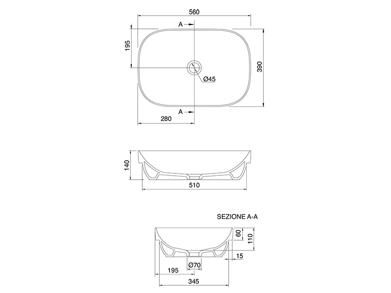 SCARABEO GLAM 1805 Раковина встраиваемая без отверстия под смеситель, без перелива. Размеры: 56x39x14h см. Высота борта раковины над столешницей 6см .цвет White.