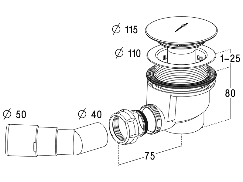 Сифон под отверстие в поддоне Ø 90мм, самоочищающийся. Декоративная хромированная крышка диаметром 115мм, угол изгиба сливной трубы 135°. Шарнирная система позволяет регулировать направление сливной трубы. Диаметр сливной трубы 40/50 мм, высота сифона 80мм.