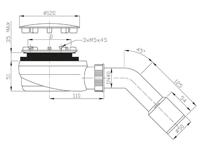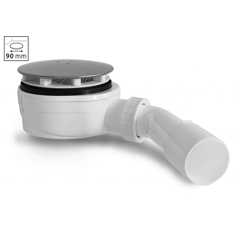 Сифон под отверстие в поддоне Ø90 mm,Очищаемый сверху сифон для душевых поддонов. Сифон оснащен дополнительным сетчатым фильтром. Высокая пропускная способность 25,5 л/мин. Крышка сифона изготовлена из нержавеющей стали. Угол изгиба сливной трубы 45 градусов.
