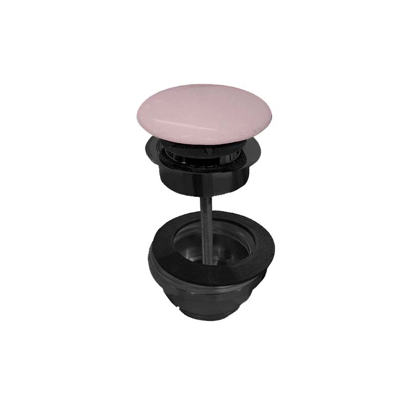 Корпус сливного устройства выполнен в матовом черном цвете, что придает ему современный и элегантный вид. Он отлично сочетается с различными интерьерами, добавляя нотку изысканности и стиля в вашу ванную комнату. Крышка нежно-розового цвета создает приятный контраст с темным корпусом, делая слив не только функциональным, но и привлекательным элементом вашего пространства.