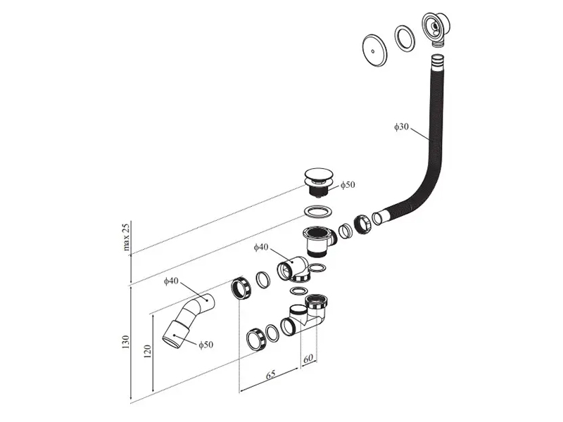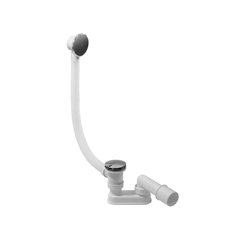 Автоматический комплект слива-перелива типа клик-клак с самоочищающимся сифоном. Пробка и сливной клапан сделаны из хромированной латуни. Крышка пробки диаметром 70мм. Длина перелива 500мм. Угол слива 135°. Диаметр слива 40/50мм. Предназначен для стандартных ванн и глубоких поддонов под отверстие в поддоне Ø 50мм