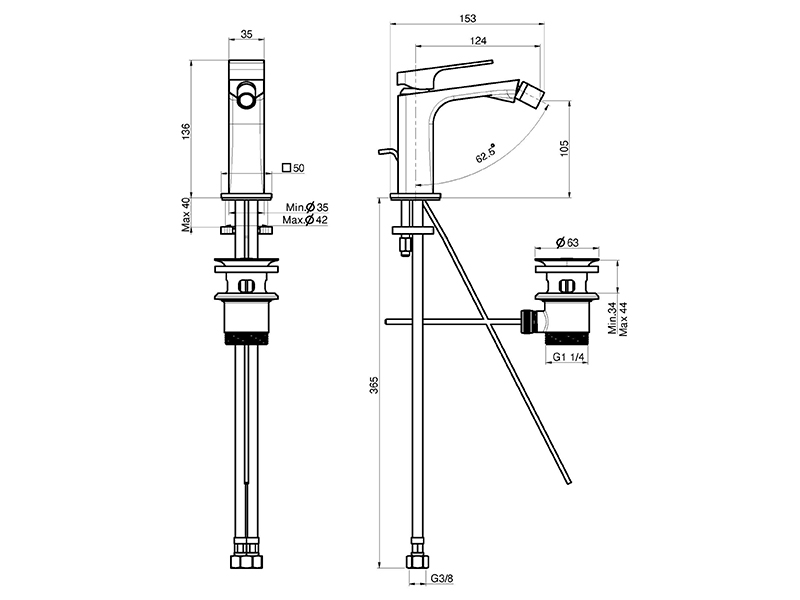 Cмеситель для биде FIMA CARLA FRATTINI FIT F3382CR, на 1 отверстие, с двумя гибкими шлангами 370 мм, донный клапан клик-клак, цвет хром.