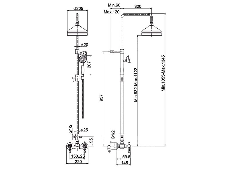 Смеситель для душа FIMA CARLO FRATTINI EPOQUE F5055/2OR внешнего монтажа с душевой штангой, верхним душем и душевым комплектом, переключатель, гибкий шланг из латуни 150 см, ручной душ из латуни, регулируемая высота, 2 подвода воды 1/2 с эксцентриком, верхний душ 20 см с защитой от извести анти-кальк, цвет золото.