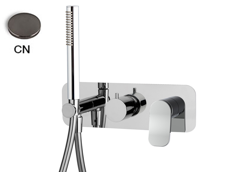 Встроенный смеситель для душа на 2 источника с душевым комплектом Fima Carlo Frattini FLO' F3819WX2CN, цвет черный хром. Только внешняя часть, держатель для душа с подводом воды, ручной душ с защитой от извести анти-кальк, переключатель, гибкий шланг хромалюкс 1500 мм, внутренняя часть (арт. F3400W) заказывается отдельно.