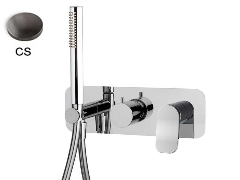 Встроенный смеситель для душа на 2 источника с душевым комплектом Fima Carlo Frattini FLO' F3819WX2CS, цвет черный хром брашированный. Только внешняя часть, держатель для душа с подводом воды, ручной душ с защитой от извести анти-кальк, переключатель, гибкий шланг хромалюкс 1500 мм, внутренняя часть (арт. F3400W) заказывается отдельно.