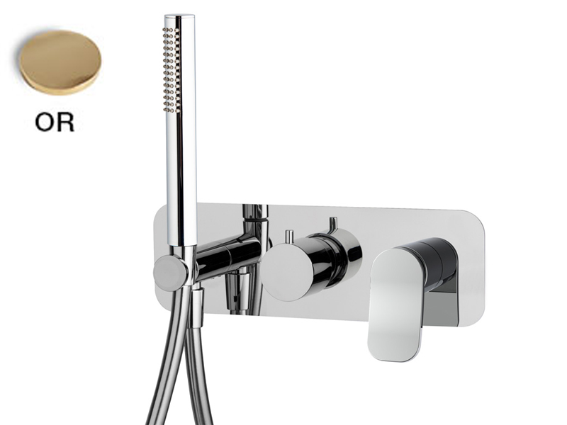 Встроенный смеситель для душа на 2 источника с душевым комплектом Fima Carlo Frattini FLO' F3819WX2OR, цвет золото. Только внешняя часть, держатель для душа с подводом воды, ручной душ с защитой от извести анти-кальк, переключатель, гибкий шланг хромалюкс 1500 мм, внутренняя часть (арт. F3400W) заказывается отдельно.