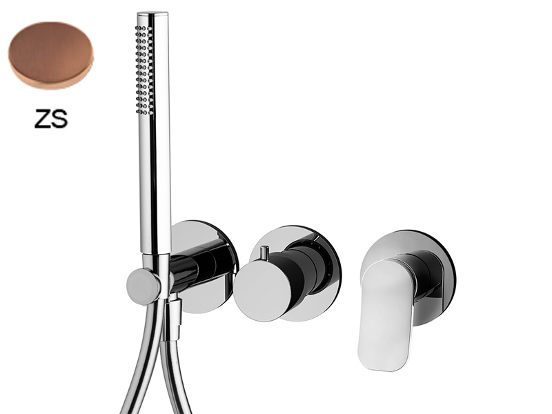 Встроенный смеситель для душа на 2 источника с душевым комплектом Fima Carlo Frattini FLO' F3819WX8ZS, цвет янтарная бронза брашированная. Только внешняя часть, держатель для душа с подводом воды, ручной душ с защитой от извести анти-кальк, переключатель, гибкий шланг хромалюкс 1500 мм, внутренняя часть (арт. F3400W) заказывается отдельно.