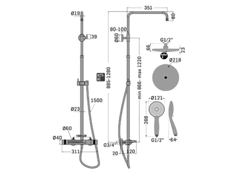 Mamoli GARCON 29070000 Смеситель для душа термостатический с душевой колонной, верхним и ручным душем, с встроенным переключателем. Цвет Chrome.