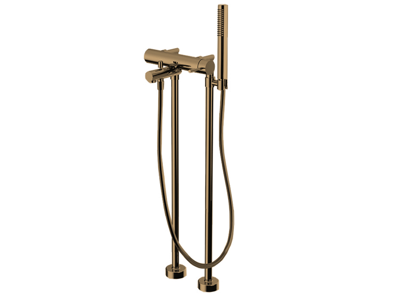 SPILLO UP Смеситель для ванны напольный в комплекте с душевым гарнитуром F3034/4OS (внешняя часть), цвет брашированное золото. Комплект труб для монтажа M 1/2”, переключатель, ручной душ с защитой от извести анти-кальк, гибкий шланг хромалюкс 1500 мм, внутренняя часть заказывается отдельно (арт. F2302).