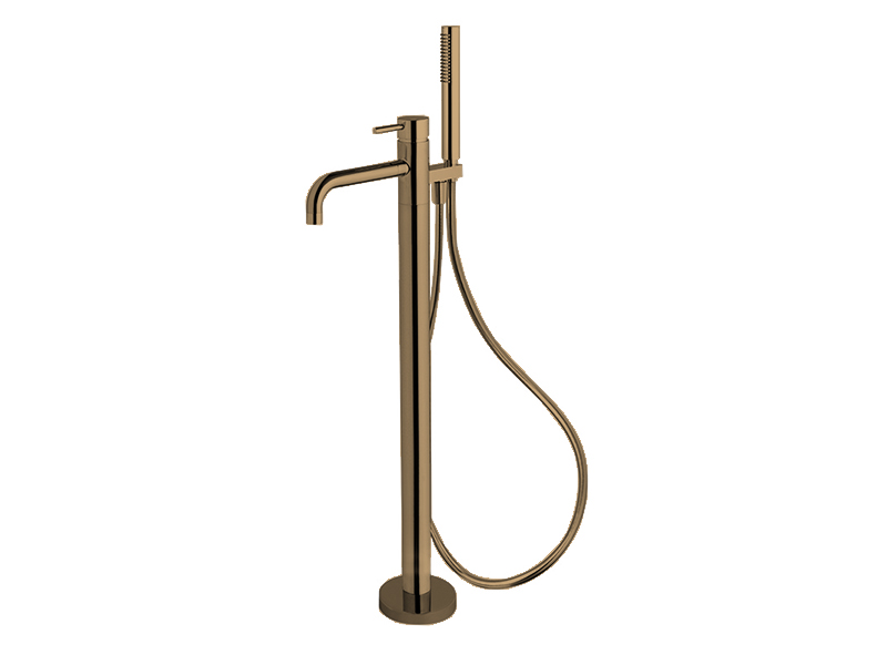 Смеситель для ванны напольный FIMA CARLO FRATTINI SPILLO UP F3034/6NOS с душевым комплектом, цвет золото брашированное. Высота от пола до аэратора 722 мм. Ручной душ с защитой от извести анти-кальк. Гибкий шланг хромалюкс 1500 мм. Внутренняя часть арт. F3020 заказывается отдельно.