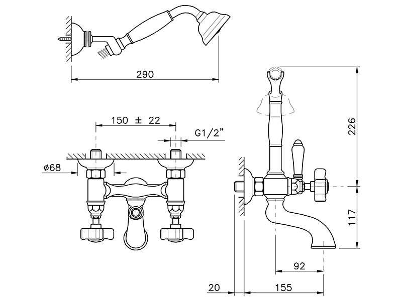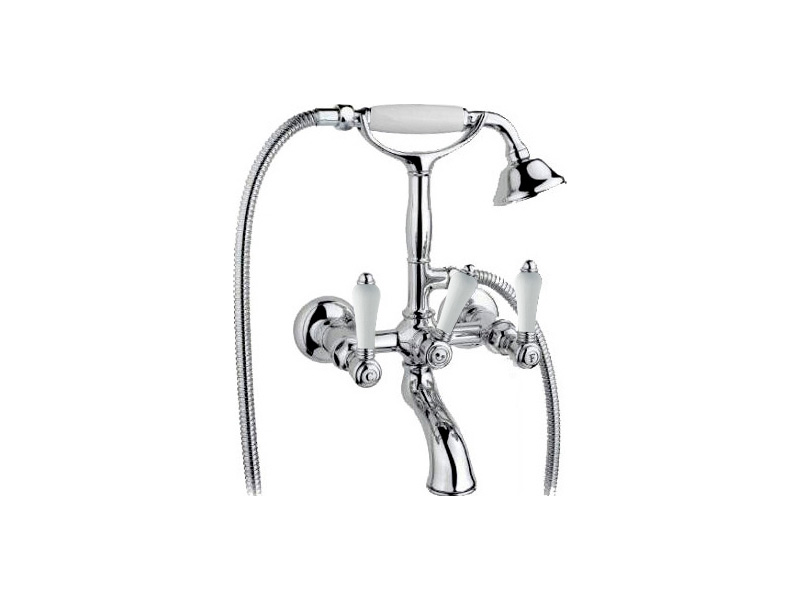 Смеситель для ванны NICOLAZZI 1402CR78, двухвентильный настенный с ручным душем, дополнительный держатель для душа настенный, цвет хром, декор P.M. Blanc.