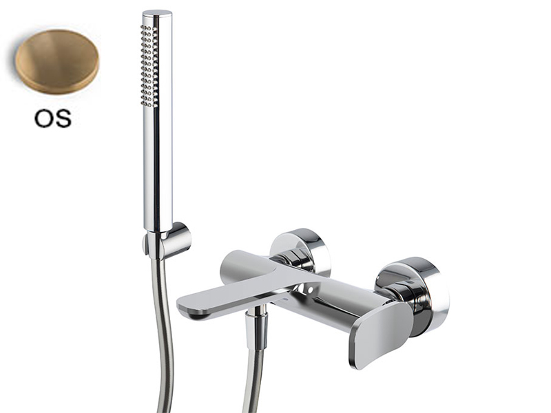 Смеситель для ванны FIMA CARLO FRATTINI FLO F3804OS внешнего монтажа с душевым комплектом, автоматический переключатель, хромированный гибкий шланг 150 см, ручной душ с защитой от извести анти-кальк, настенный держатель, 2 подвода воды 1/2 с эксцентриком, цвет брашированное золото.