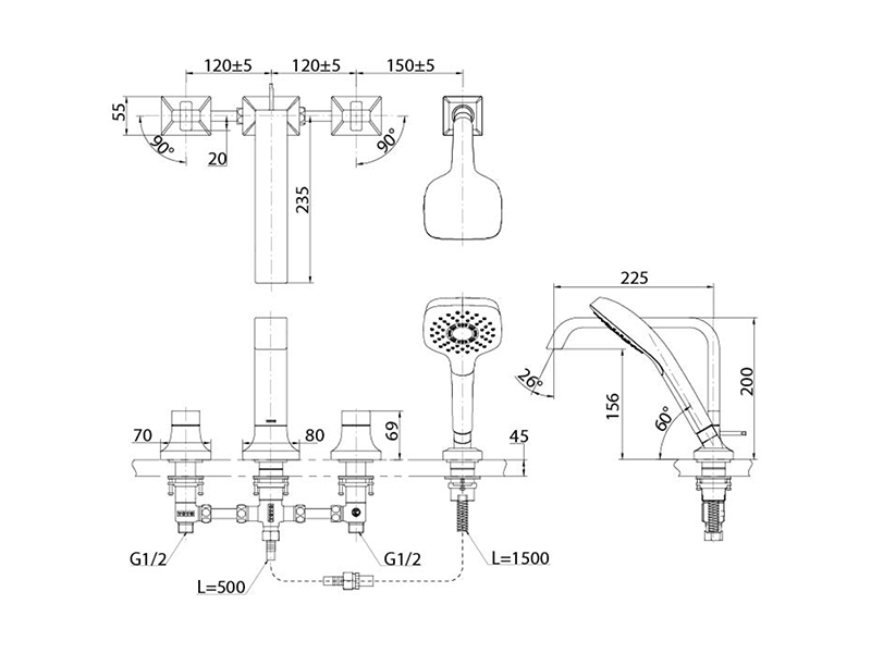 TOTO GC Смеситель для ванны в борт на 4 отверстия с ручным душем, цвет хром. Размеры:48x26,2x22,6 см.Технология COMFORT WAVE.