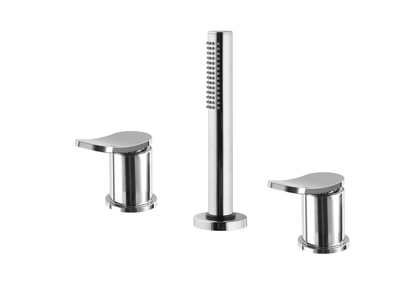 Смеситель к борту ванны Fima Carlo Frattini FLO' F3814/1NCR на 3 отверстия, цвет хром. Дввухрычажный смеситель, держатель для душа, гибкая подводка нейлоновая 1500 мм, ручной душ с защитой от извести анти-кальк.