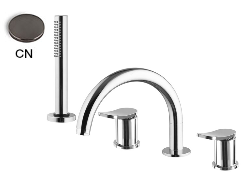 Смеситель на борт ванны Fima Carlo Frattini FLO' F3814NCN, цвет черный хром. Излив 232 мм, двухрычажный смеситель, держатель для душа, гибкая подводка нейлоновая 1500 мм, ручной душ с защитой от извести анти-кальк.