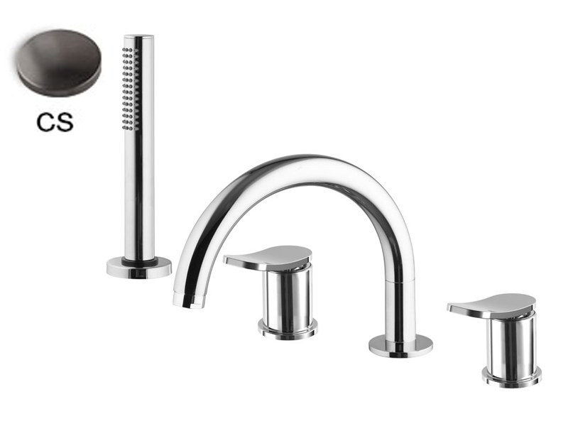 Смеситель на борт ванны Fima Carlo Frattini FLO' F3814NCS, цвет черный хром брашированный. Излив 232 мм, двухрычажный смеситель, держатель для душа, гибкая подводка нейлоновая 1500 мм, ручной душ с защитой от извести анти-кальк.