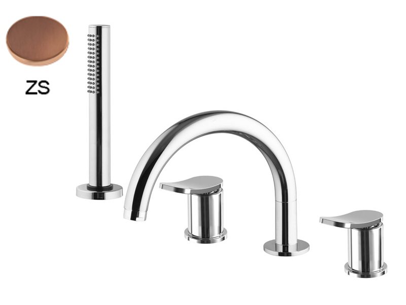 Смеситель на борт ванны Fima Carlo Frattini FLO' F3814NZS, цвет янтарная бронза брашированная. Излив 232 мм, двухрычажный смеситель, держатель для душа, гибкая подводка нейлоновая 1500 мм, ручной душ с защитой от извести анти-кальк.