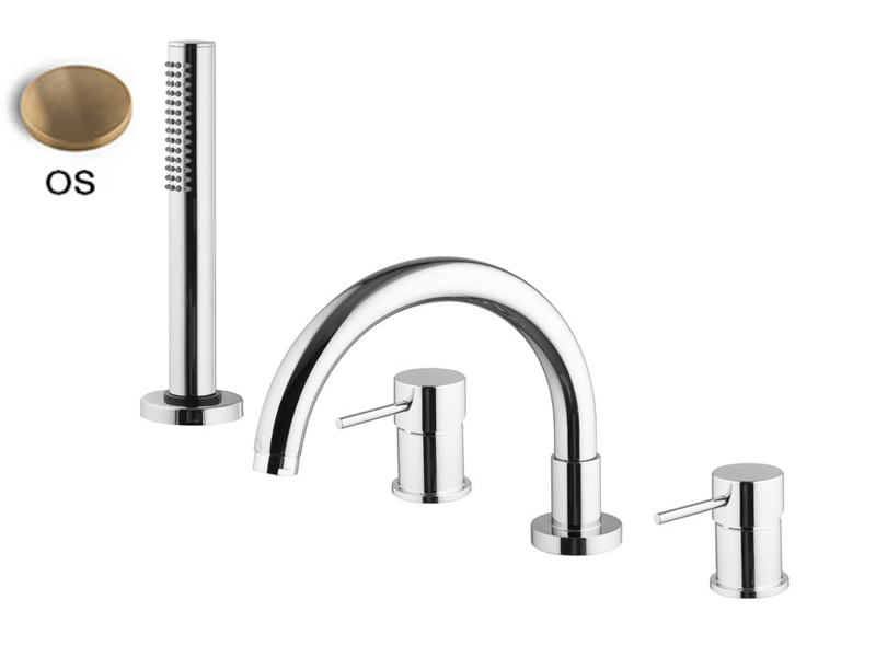 Смеситель на борт ванны FIMA CARLO FRATTINI SPILLO UP F3044NOS на 4 отверстия: переключатель, гибкий нейлоновый шланг 1500 мм, ручной душ с защитой от извести анти-кальк, держатель для душа, цвет брашированное золото.