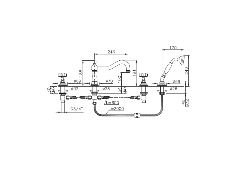 Смеситель на борт ванны двухвентильный NICOLAZZI 1449CR78, на 4 отверстия на борт ванны, цвет хром, декор P.M.BLANC.