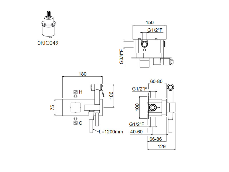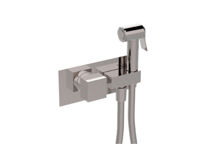 Carimali 19710/C-120-CR MINI Смеситель встраиваемый, 1-ходовой скрытый, прогрессивный с системой безопасности. Встроенный держатель для гигиенического душа. Душевой рычаг из латуни со сменным фильтром и капельная система. Гладкий двойной анти-торсионный гибкий шланг из ПВХ 120 cm. Квадратная пластина и ручки. Цвет хром.