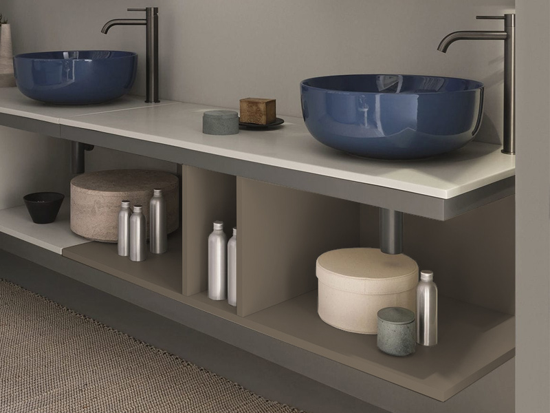 CIELO MULTIPLO MUMBG120CM Тумба под раковину подвесная с открытыми полками в цвете Arenaria c структурой из стали в отделке Cemento. Обязательное сочетание тумба MUMBG120CM или MUMBG120NM + столешница керамическая MUPI120.