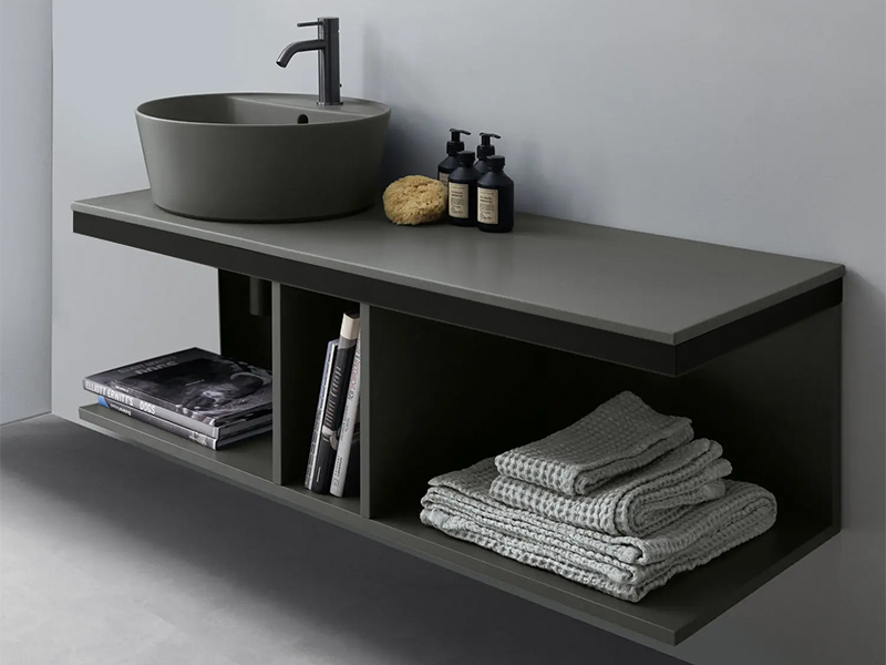 CIELO MULTIPLO MUMBG120CM Тумба под раковину подвесная с открытыми полками в цвете Cemento c структурой из стали в черном цвете. Обязательное сочетание тумба MUMBG120CM или MUMBG120NM + столешница керамическая MUPI120.