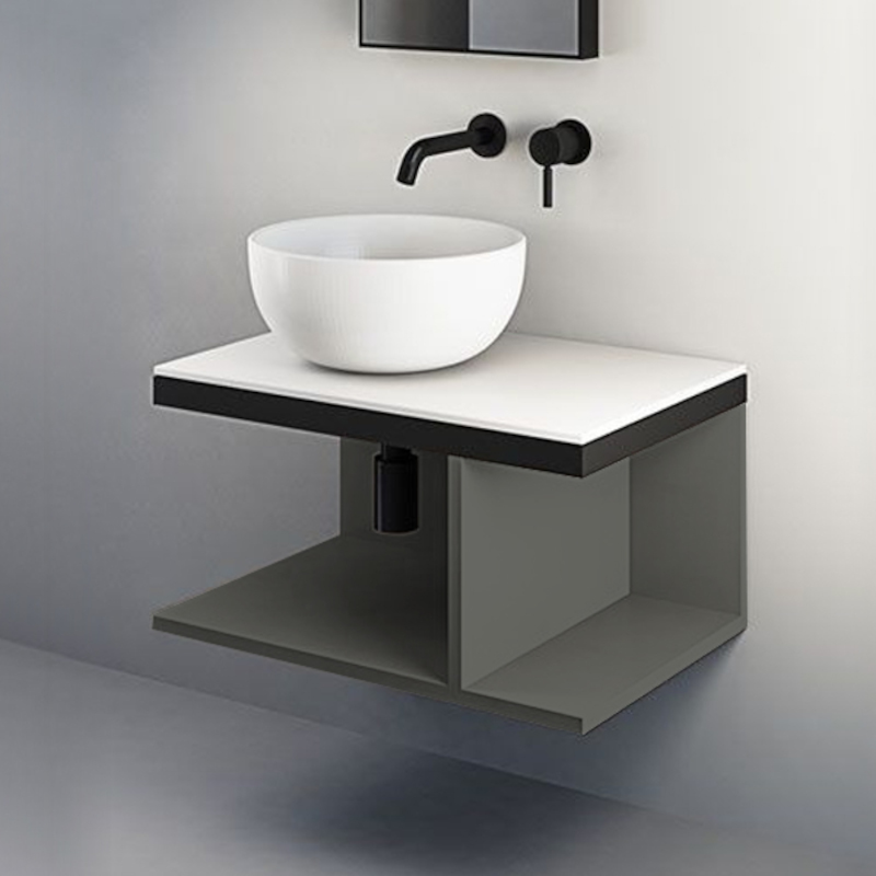 CIELO MULTIPLO MUMBG70CM Тумба под раковину подвесная с открытыми полками в цвете Cemento c структурой из стали в черном цвете. Обязательное сочетание тумба MUMBG70CM или MUMBG70NM + столешница керамическая MUPI70.
