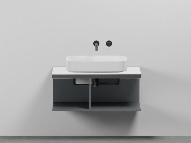 CIELO MULTIPLO MUMBG90DXCM Тумба под раковину подвесная с открытыми полками (перегородка полки смещена влево) в цвете Basalto c структурой из стали в отделке Cemento. Обязательное сочетание тумба MUMBG90CM или MUMBG90NM + столешница керамическая MUPI90.