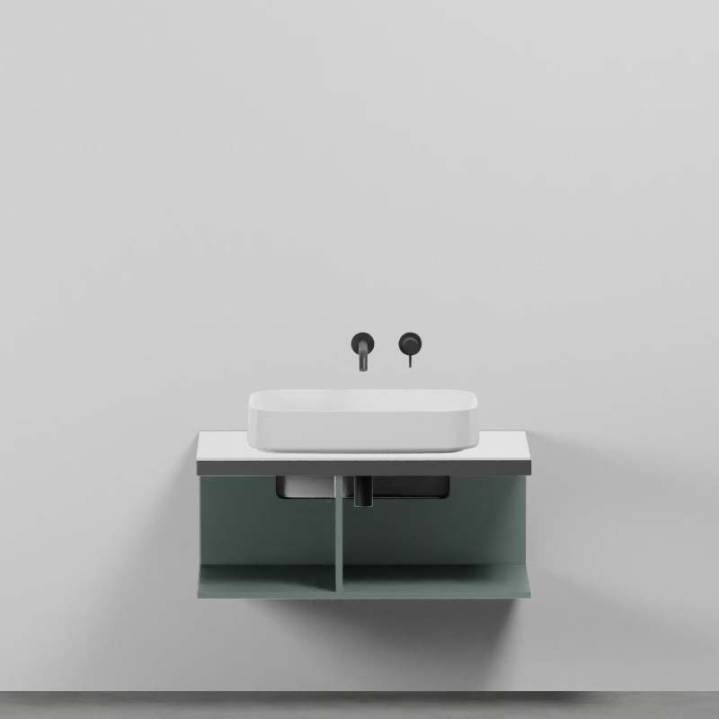 CIELO MULTIPLO MUMBG90DXCM Тумба под раковину подвесная с открытыми полками (перегородка полки смещена влево) в цвете Arenaria c структурой из стали в отделке Muschio. Обязательное сочетание тумба MUMBG90CM или MUMBG90NM + столешница керамическая MUPI90.