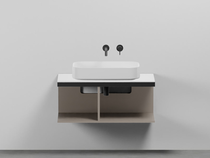 CIELO MULTIPLO MUMBG90DXNM Тумба под раковину подвесная с открытыми полками (перегородка полки смещена влево) в цвете Arenaria c структурой из стали в черном цвете. Обязательное сочетание тумба MUMBG90CM, MUMBG90NM, MUMBG90DXNM, MUMBG90DXCM + столешница керамическая MUPI90.