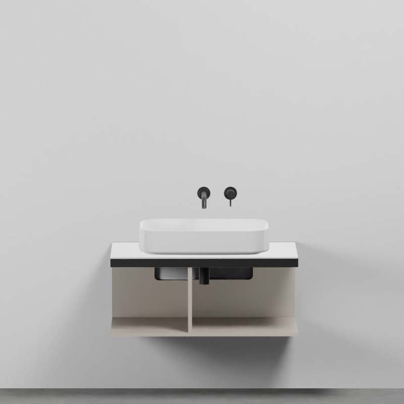 CIELO MULTIPLO MUMBG90DXNM Тумба под раковину подвесная с открытыми полками (перегородка полки смещена влево) в цвете Avena c структурой из стали в черном цвете. Обязательное сочетание тумба MUMBG90CM, MUMBG90NM, MUMBG90DXNM, MUMBG90DXCM + столешница керамическая MUPI90.