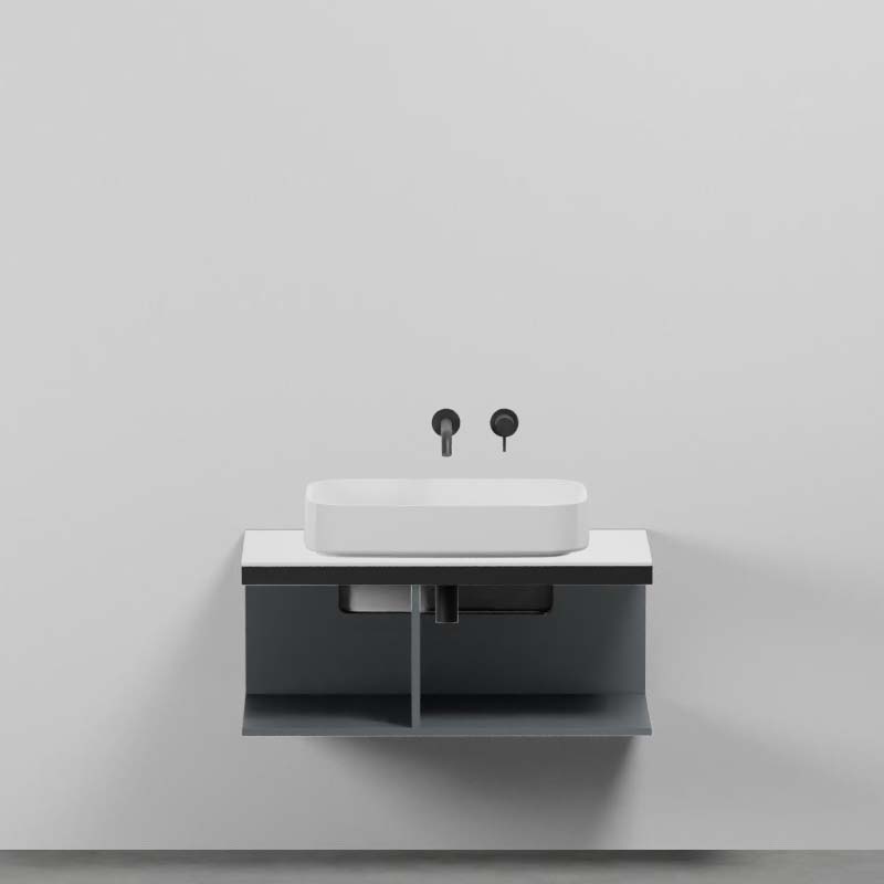 CIELO MULTIPLO MUMBG90DXNM Тумба под раковину подвесная с открытыми полками (перегородка полки смещена влево) в цвете Basalto c структурой из стали в черном цвете. Обязательное сочетание тумба MUMBG90CM, MUMBG90NM, MUMBG90DXNM, MUMBG90DXCM + столешница керамическая MUPI90.