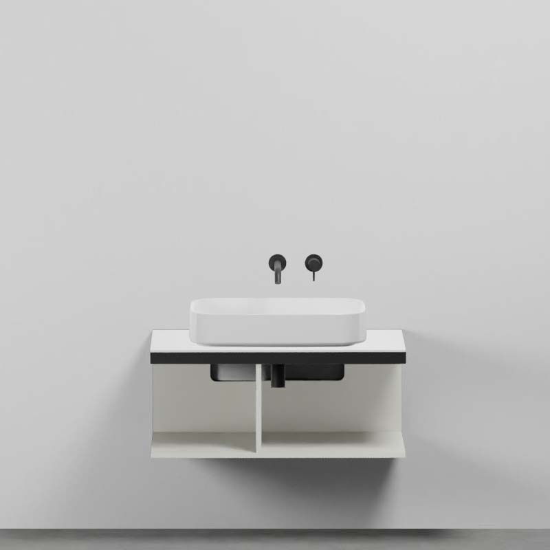 CIELO MULTIPLO MUMBG90DXNM Тумба под раковину подвесная с открытыми полками (перегородка полки смещена влево) в цвете Pomice c структурой из стали в черном цвете. Обязательное сочетание тумба MUMBG90CM, MUMBG90NM, MUMBG90DXNM, MUMBG90DXCM + столешница керамическая MUPI90.